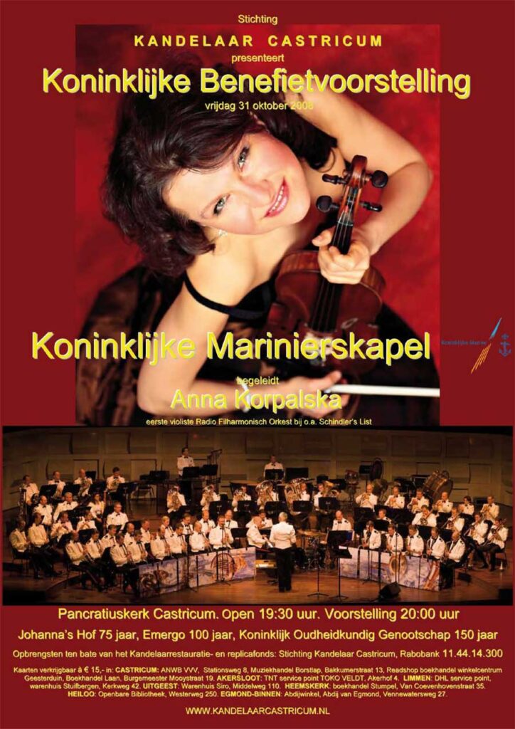 Koninklijke Benefietvoorstelling vrijdag 31 oktober 2008, Pancratiuskerk Castricum. Een gezamenlijke productie van de Marinierskapel der Koninklijke Marine, Anna Korpalska, eerste violiste van het Radio Filharmonisch Orkest en de “bruidsparen” van Danssportschool Ger van Zandwijk uit Amsterdam-Noord. Openingswoorden door Ton Werner Spruit, voorzitter Stichting Kandelaar Castricum en Mr. W.F. Dutilh, honorair consul van Polen. Door omstandigheden is de burgemeester Emmens-Knol verhinderd en zij wenst ons een fijne avond toe.